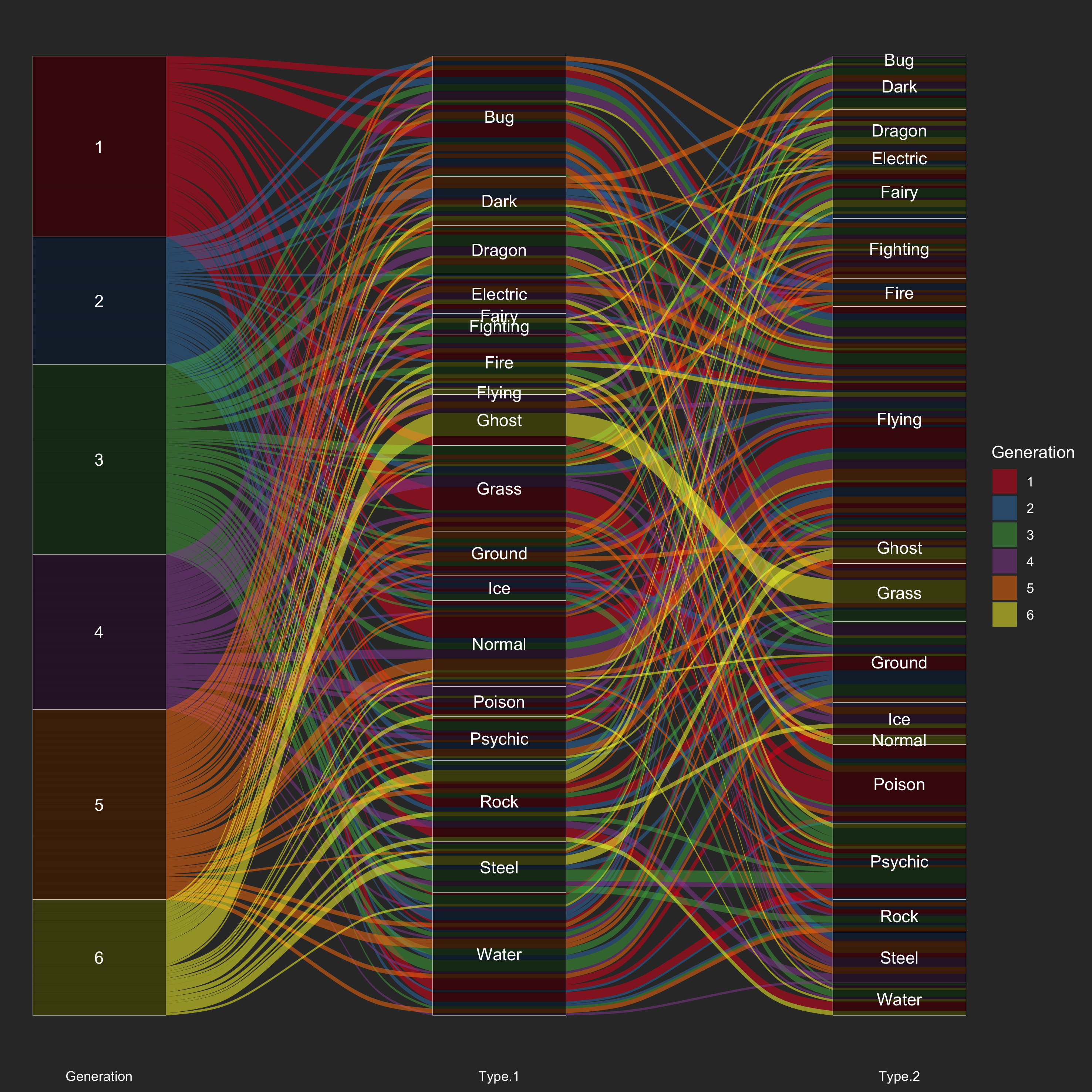 Like TV shows, Pokémon also has multiple seasons due to different versions of the Pokémongames and aminations. It is called "generation" in the Pokémon world. In generation one, the most frequent Pokémons' first types are Bug, Grass, and Normal. In generation six, there are more Ghost, Rock, and Steel.
